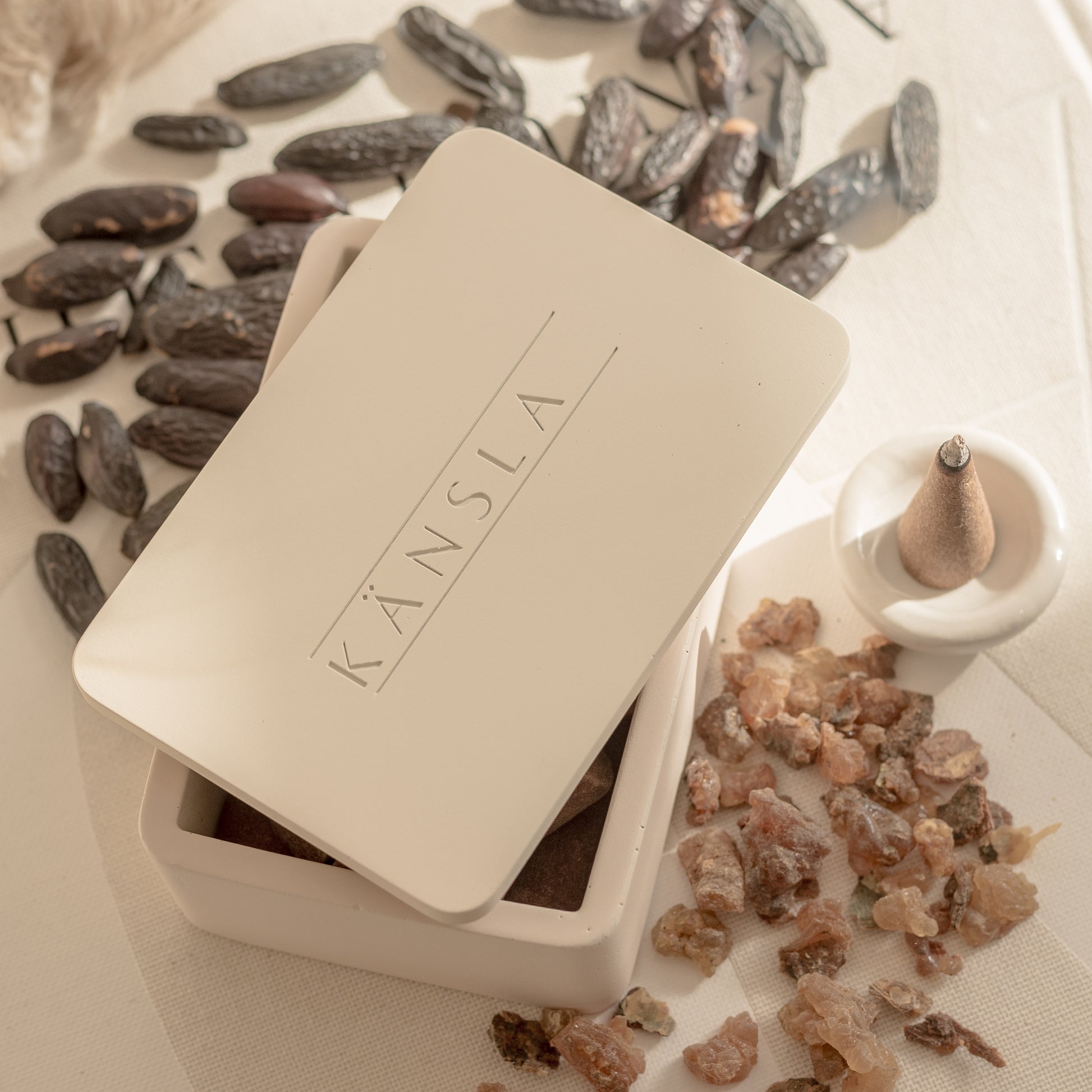 15 large, natural and refillable incense cones housed in a concrete box with a ceramic burning dish. Designed to make a statement, infuse your space and ignite your senses. Handcrafted using the finest natural ingredients to deliver a strong, room filling aroma. Känsla incense cones add a touch of elegance to your daily routines, a must have for modern, luxury living.