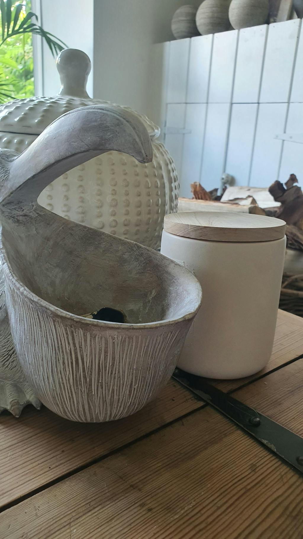 Concrete vessel and wooden lid (H 12cm D 9cm)